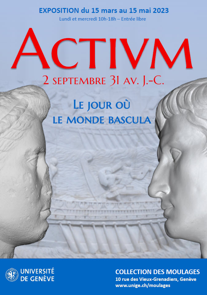 A partir des moulages d’une partie des reliefs commémoratifs de la bataille d’Actium, et d’autres objets appartenant à la Collection des moulages de l’Université de Genève, l’exposition retrace le déroulement de l’événement, tout en évoquant ses principaux acteurs, la célébration de la victoire et ses bienfaits dans la propagande augustéenne.