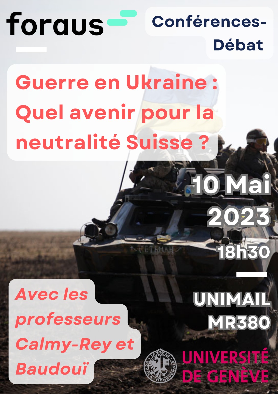 Le groupe régional foraus de Genève organise le 10 mai prochain, à 18h30 : une conférence-débat sur la neutralité suisse à travers le prisme de la guerre en Ukraine, avec comme invités le Professeur Baudouï et Mme Micheline Calmy-Rey, ancienne conseillère fédérale. N'hésitez pas à nous rejoindre pour une conversation de haut vol!