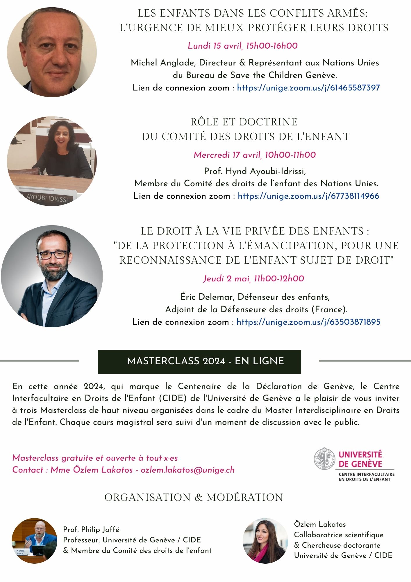 En cette année 2024, qui marque le Centenaire de la Déclaration de Genève, le Centre Interfacultaire en Droits de l'Enfant (CIDE) de l'Université de Genève a le plaisir de vous inviter à trois Masterclass de haut niveau organisées dans le cadre du Master Interdisciplinaire en Droits de l'Enfant. Chaque cours magistral sera suivi d'un moment de discussion avec le public.