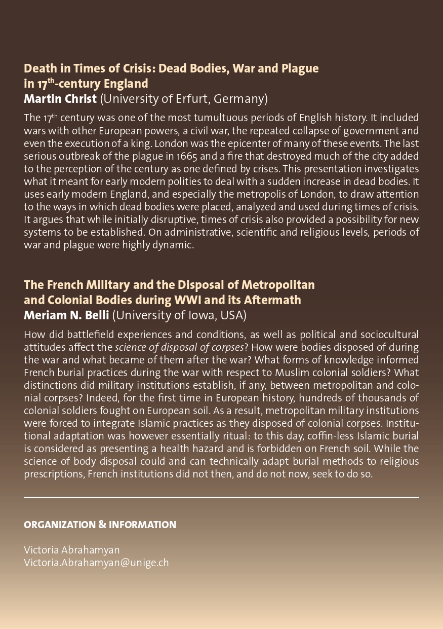 Cette conférence réunit deux intervenants. Dr Martin Christ s'attachera à analyser l’épidémie de peste qui frappa Londres en 1665, et notamment aux modes de gestion de la mort. Prof Meriam N. Belli s'intéressera aux pratiques funéraires françaises durant la Première Guerre mondiale, portant une attention particulière aux soldats coloniaux musulmans.