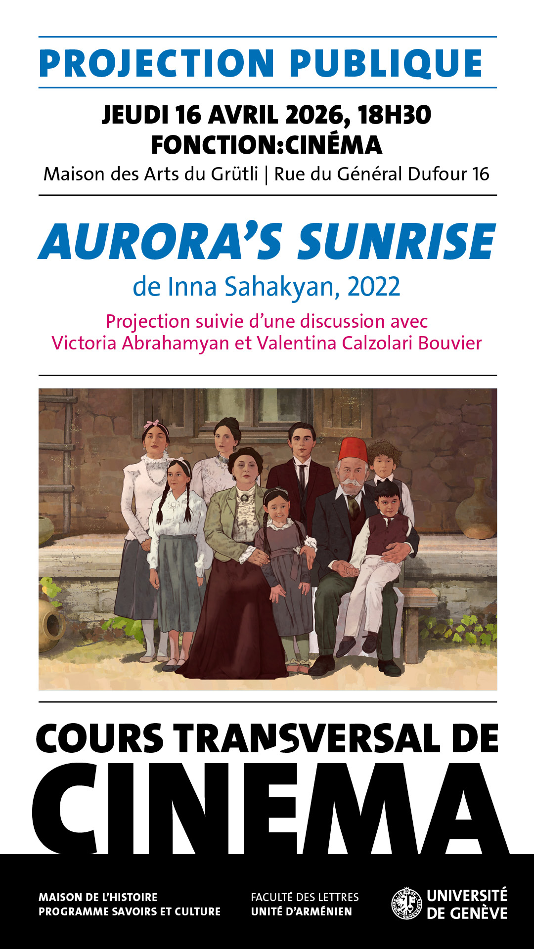 Dans le cadre du cours transversal de la prof. Valentina Calzolari “La Catastrophe à l'épreuve de l'image : génocide et cinéma", l'Unité d'arménien a le plaisir de vous inviter à la projection publique de Aurora's Sunrise de Inna Sahakyan, suivie d'un débat avec Victoria Abrahamyan et Valentina Calzolari